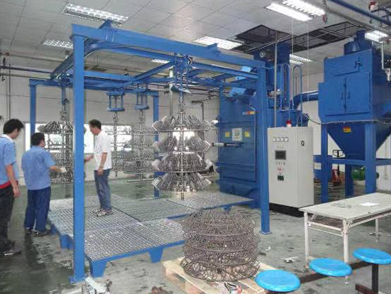吊鉤式拋丸機的工作原理:當拋丸機開始工作時,是先啟動除塵系統等裝置和部件,然后讓設備主機開始運行。將吊鉤下降來吊起工件并上升到規定位置上,然后沿軌道進入拋丸清理室進行拋丸清理,此時拋丸清理室大門是關閉狀態,等到拋丸清理工作結束后再打開,以便送出處理后的工件。