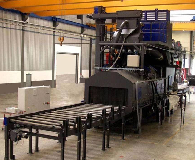 爬架在輸送輥道上,輥道輸送系統將爬架向前輸送,當爬架進入清理室時,拋丸機開始順序工作。經過拋丸處理后,爬架表面的氧化皮、污物及其他附著物被清理干凈,處理過的表面可達光滑整潔,爬架拋丸機的工作方式就是連續循環進行的。