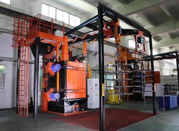 雙吊鉤式拋丸機由兩個吊鉤裝載工件交替進入拋丸清理室內。利用拋丸器將0.2~0.8的彈丸拋向工件的表面,使得工件的表面達到一定的粗糙度,讓工件變得美觀,或者改變工件的壓應力提高壽命。本機型廣泛應用于鑄造、建筑、化工、電機、機床等行業的中、小型鑄、鍛件的表面清理或強化處理。