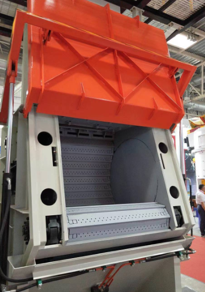 第四,將履帶放入到清理室中,對于比較大的履帶可以使用室體頂部開眼,用鋼絲穿入懸吊的方式安裝,也可以在拋丸器葉輪位置固定一個手拉葫蘆來拉動履帶。